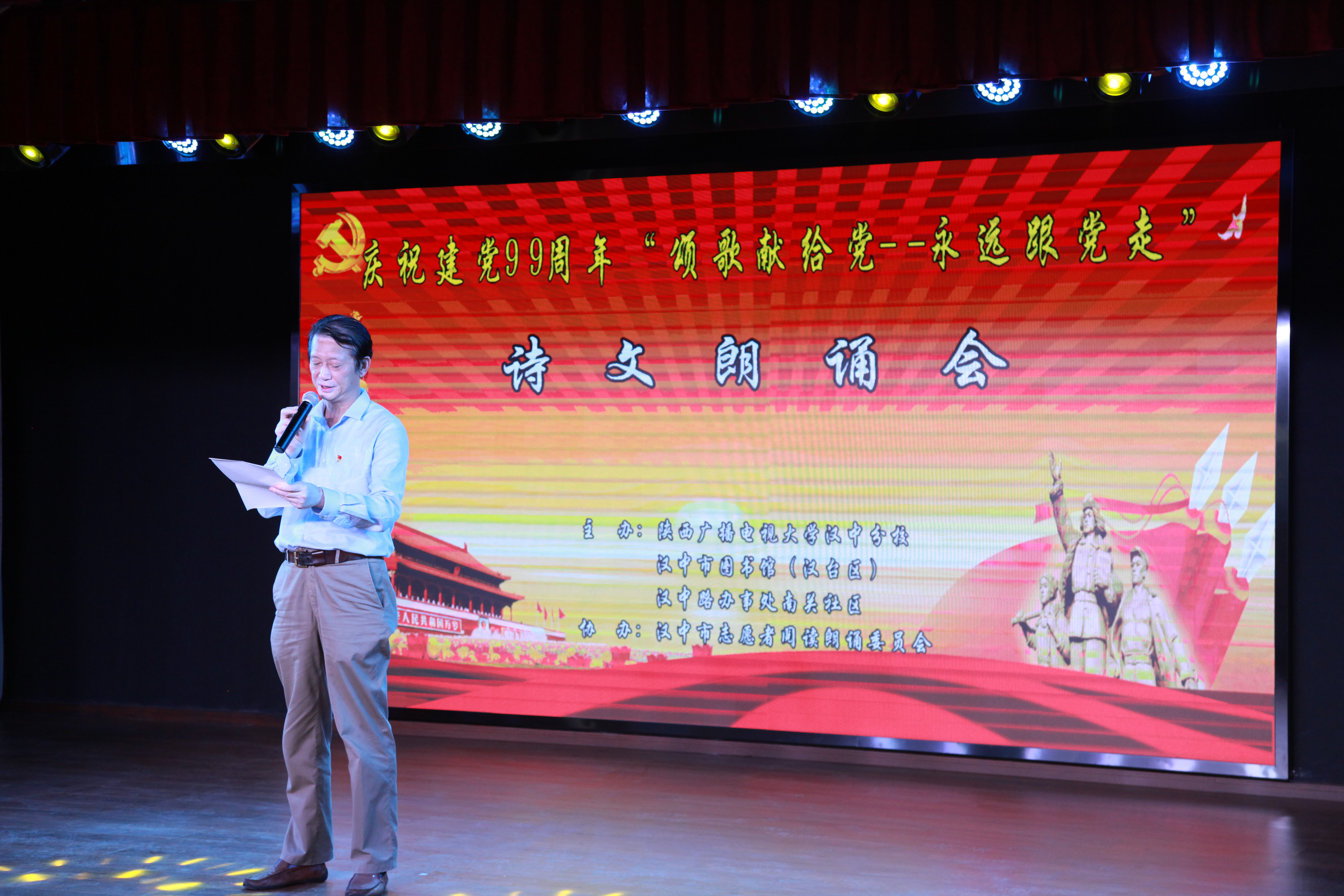 为隆重庆祝中国共产党成立99周年,重温党的光辉历程,歌颂党的伟大成就,进一步活跃校园文化,激发党员干部爱国爱党、爱岗敬业的热情,增强党组织的凝聚力和战斗力。6月29日,汉中电大举办了“颂歌献给党永远跟党走”诗文朗诵活动。活动邀请了市图书馆、汉中路办事处南关社区和市志愿者阅读朗诵委员会委员共同参加。